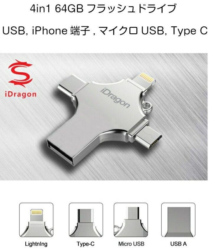 商品詳細 商品説明 iPhone、アンドロイドの容量不足を解消してくれる、大容量64GB 4in1 フラッシュドライブです。